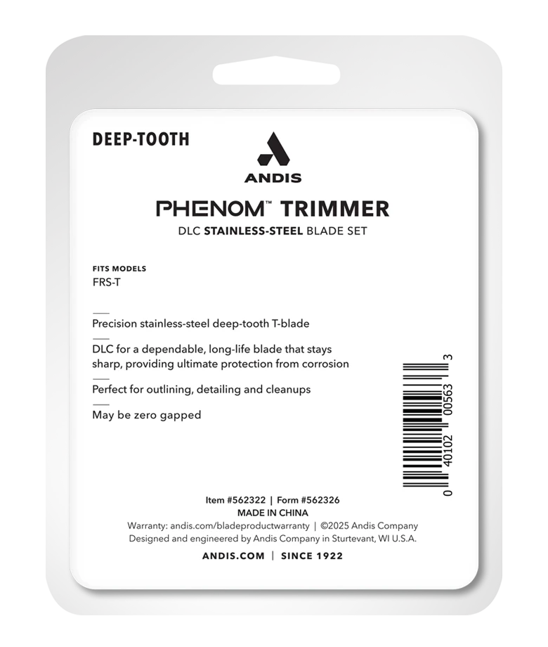 DLC bevonatú, deep-tooth T-penge az Andis Phenom Trimmer (FRS-T) modellhez. Precíz kontúrozáshoz, részletmunkákhoz és tisztázáshoz tervezve. Zero-gap beállításra alkalmas kivitel.